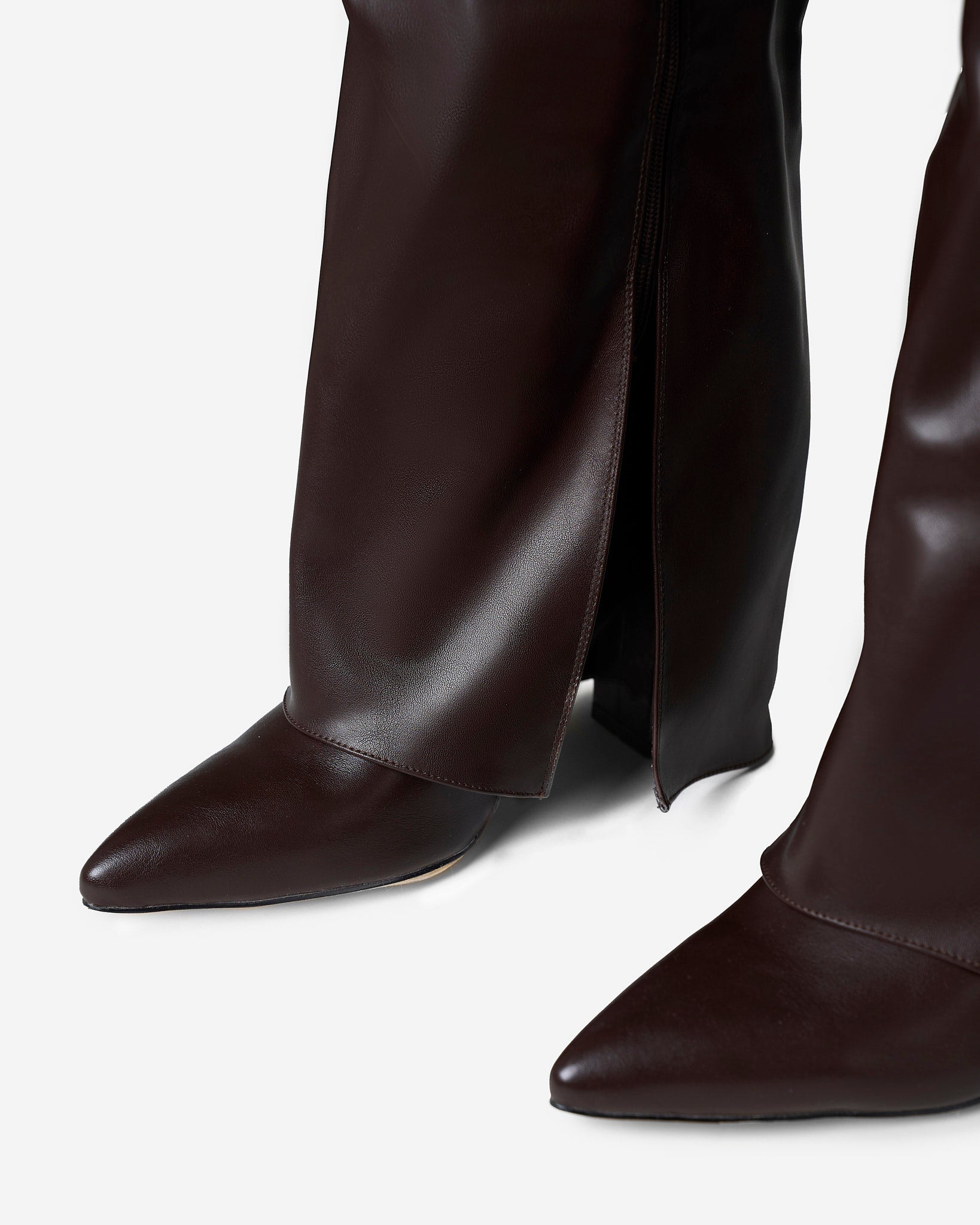 The boots feature an amazing handmade leather material which covers the whole of the shoe including the leg for maximum effect with a stunning fold over detail. The boot also feature a cute buckle detail on top and have a hidden heel. style with knitwear for a glam fall look.