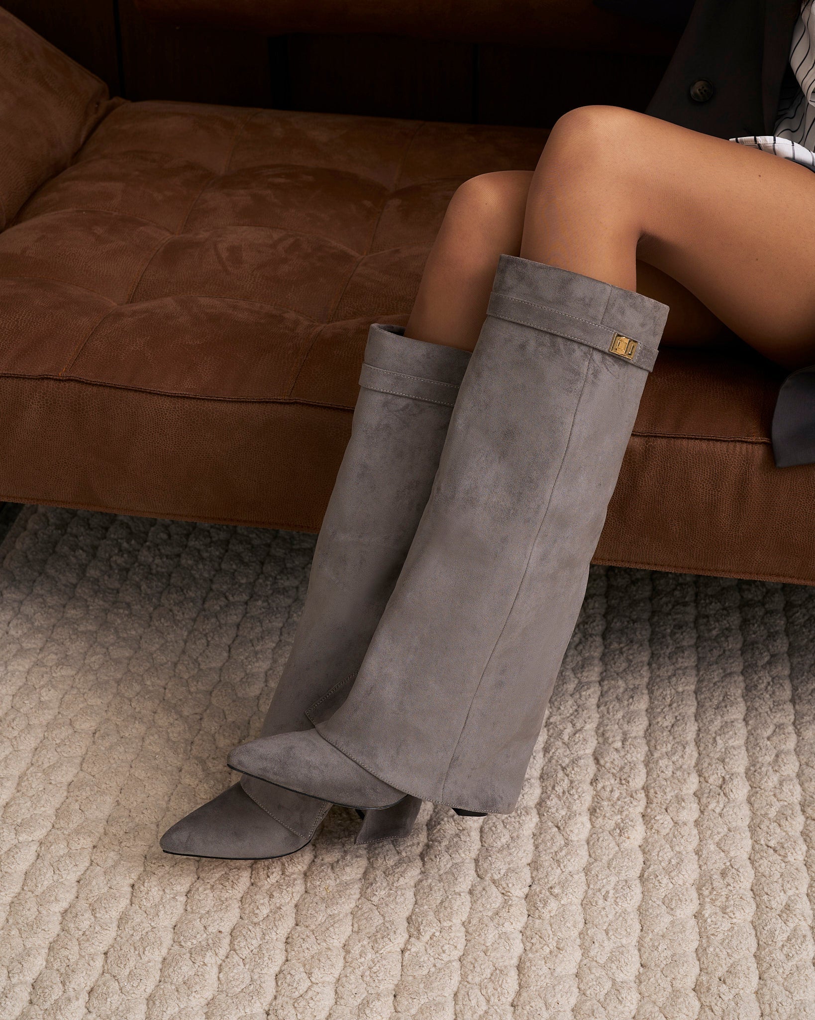 The boots feature an amazing handmade suede material which covers the whole of the shoe including the leg for maximum effect with a stunning fold over detail. The boot also feature a cute buckle detail on top and have a hidden heel. style with knitwear for a glam fall look.