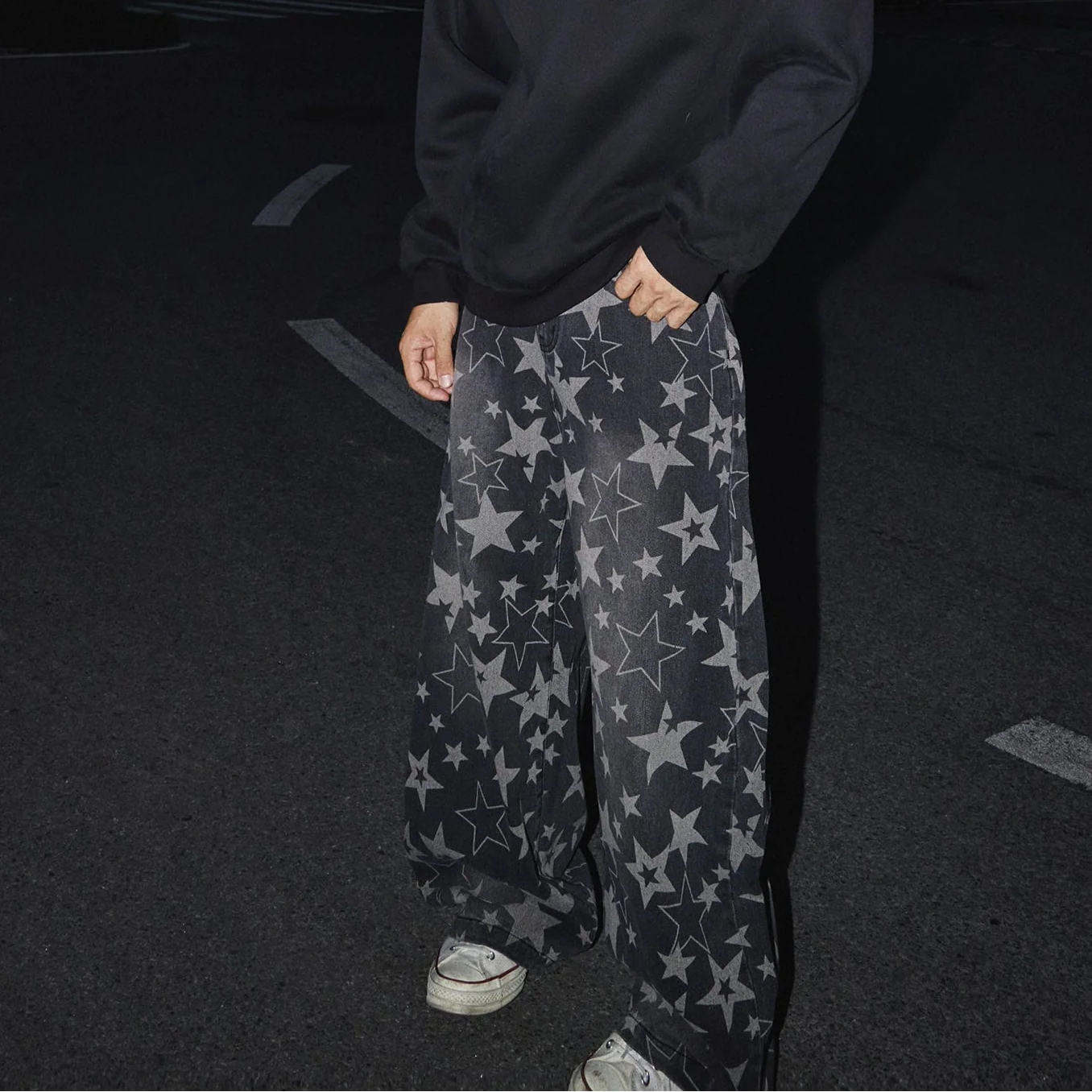 This features a pair of wide-leg pants in a washed black finish, boldly decorated with an all-over star print. The relaxed silhouette and loose fit provide laid-back comfort, while the eye-catching star pattern adds a playful, statement-making touch. Perfect for those who want to bring a fun, streetwear-inspired vibe to their casual looks.
